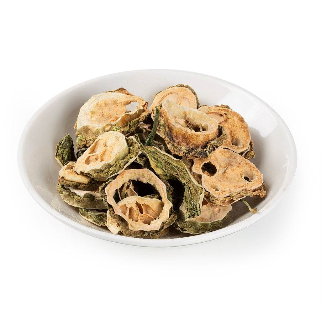 Balsam Pear, bitter melon, or bitter gourd, is an edible fruit grown in Asia, Africa, and the Caribbean. It has been traditionally used as a home remedy for various illnesses. This wrinkly looking cucumber is often consumed when feeling sick to help release heat from the body.