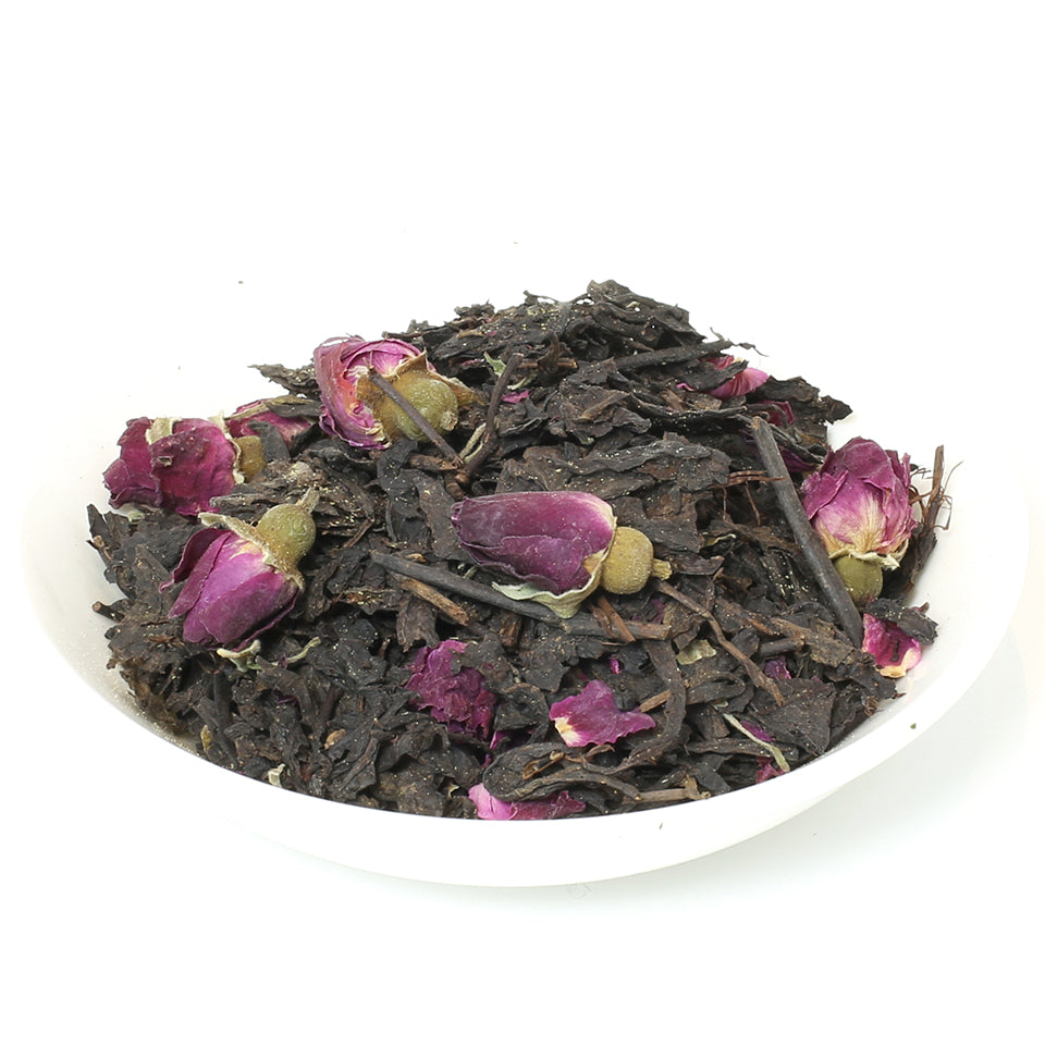Fucha, a famous dark brick tea, also known as Golden flower, goes through a second fermentation as lightly compressed bricks, hence the golden spores on the black tea leaves. Traditionally enjoyed in China for its rich, unique full-bodied flavors, of wood and dates, along with a myriad of health benefits such as aiding digestion, metabolism, sugar and blood pressure levels. This black tea is blended with Shandong Roses, also known for detox, clearing the skin, and a boost of immunity for a delightfully strong rosy brew.